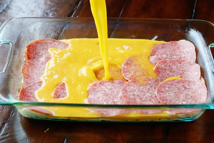 An easy, cheesy, Italian Breakfast Casserole. Layer crescent rolls, ham, salami, eggs, bell peppers and cheese, then bake for 30 mins. Perfect for breakfast, lunch, or breakfast for dinner!